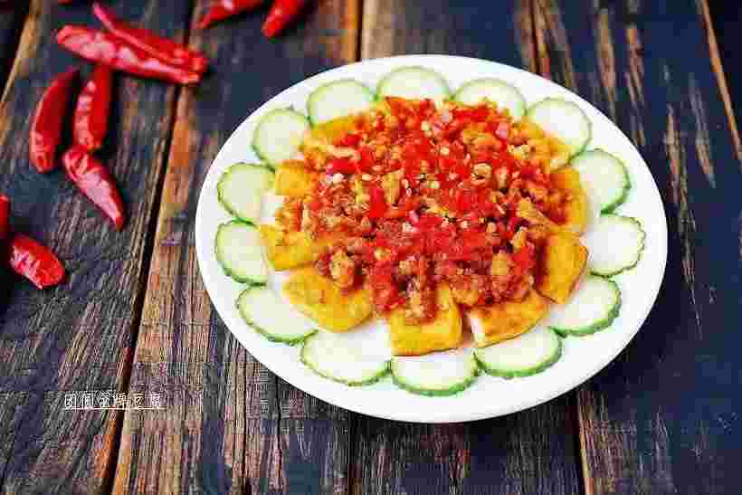 11、将炒好的素肉末,铺在豆腐上,铺上小米辣即可。
