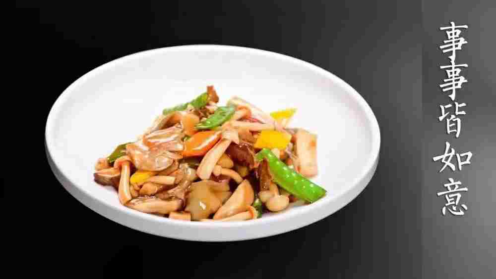 榆耳、荷兰豆、白玉菇、杏鲍菇、平菇、鲜香菇、彩椒、南乳汁、素蚝油、生抽、糖、蘑菇精、香油、生粉水