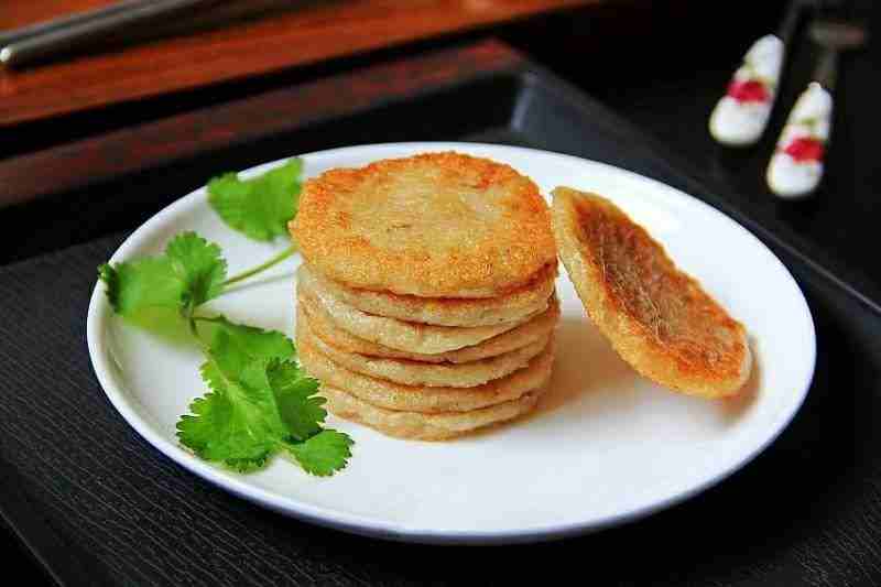 6、不粘锅烧热,下油,双手粘水,取适量糯米糊团成团,放锅中,再压成饼