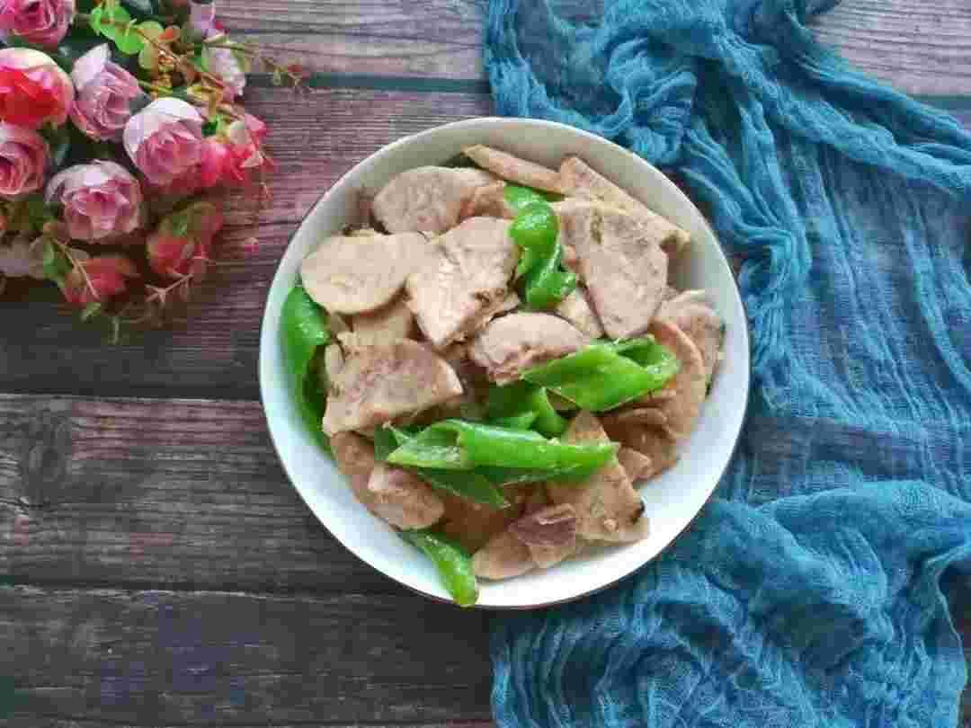 7、加入青椒翻炒均匀,加入蔬果粉炒至青椒断生即可盛出