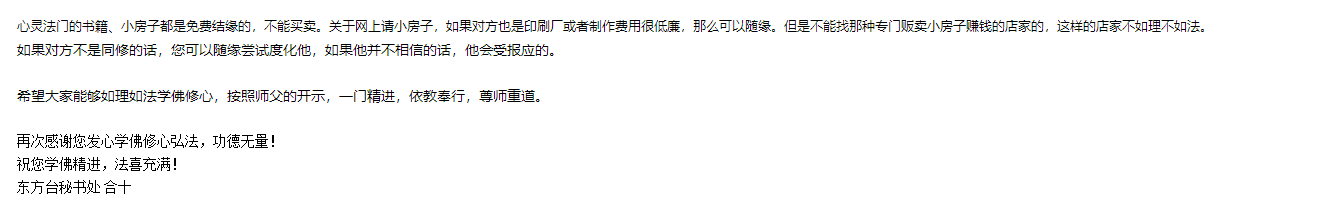 助印经文和小房子等,请务必以东方台制作的版本为准,不宜随意印刷同修自己编辑的书籍,此前已经有一些与台长的开示不符或者不准确的情况出现,所以希望务必以东方台版本为准。在每次助印之前,都可以发邮件过来索要最新电子版书籍。